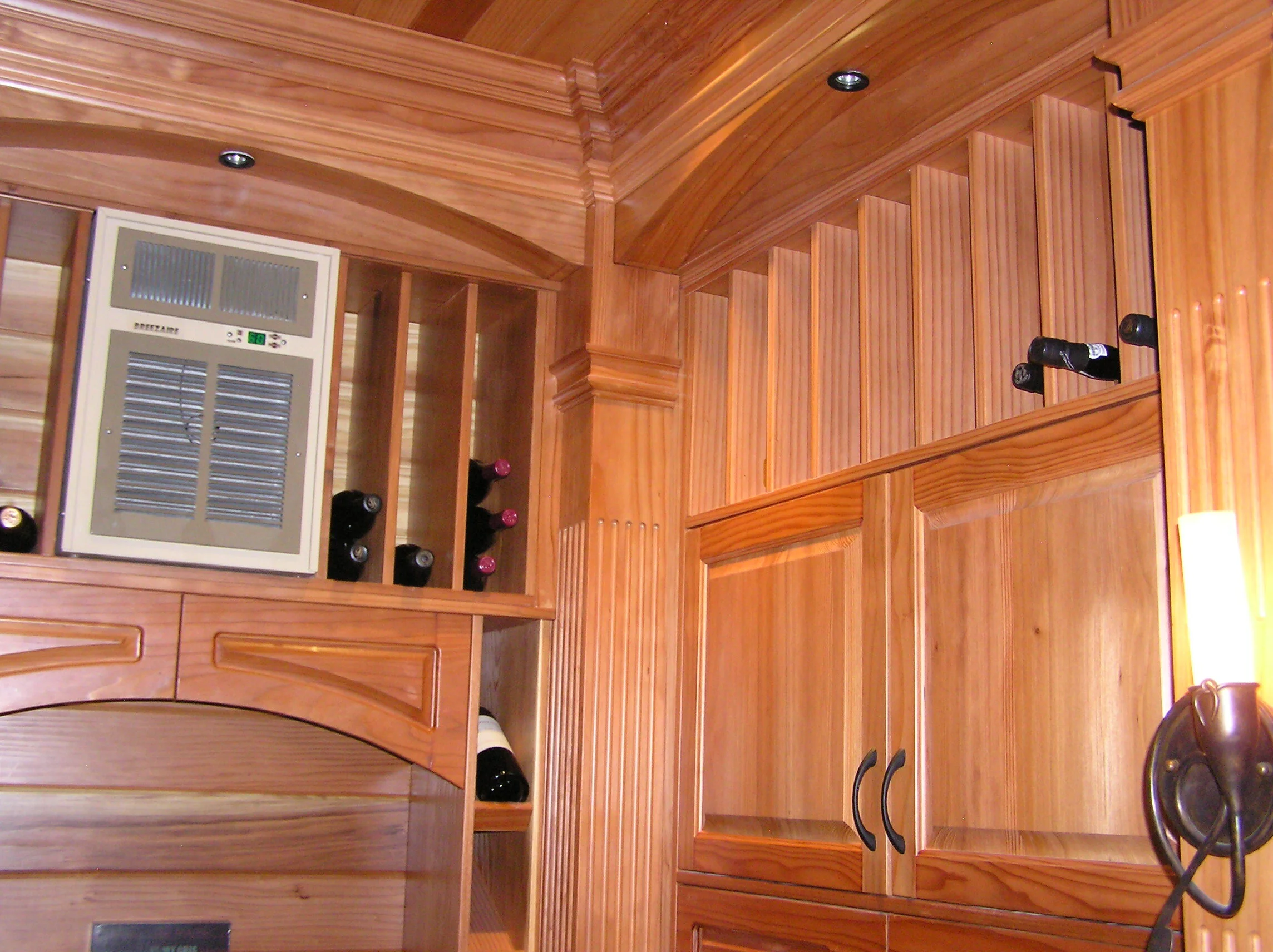 This beautiful wine room was converted from an existing room in the house. It features 600+ bottle storage, temperature and humidity control, a smooth slate floor, and quality red wood.